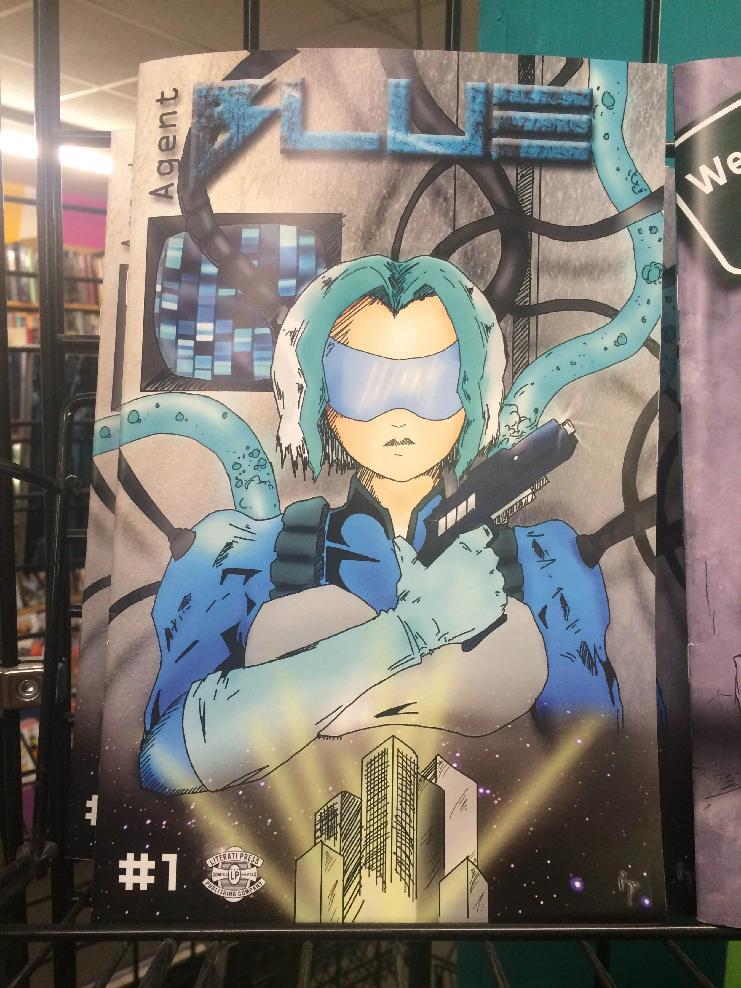 "Agent Blue" writer, drawn by Don Rosencrans, flip comic with "Welcome to Ralton," published by Literati Press.